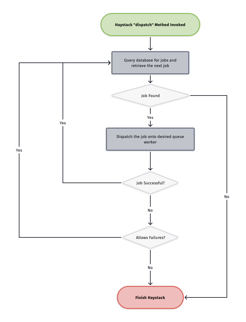 Laravel Haystack works by storing your jobs on the database and then queuing the job onto the desired connection. The Flowchart below represents the flow Haystack follows.